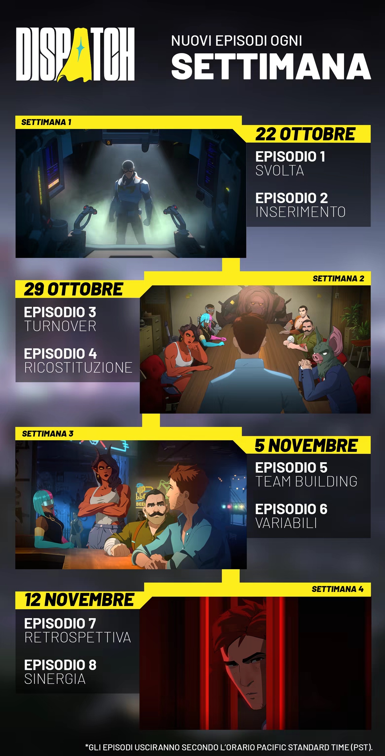 Qui sotto l’immagine con la data d’uscita e il nome di ogni episodio: