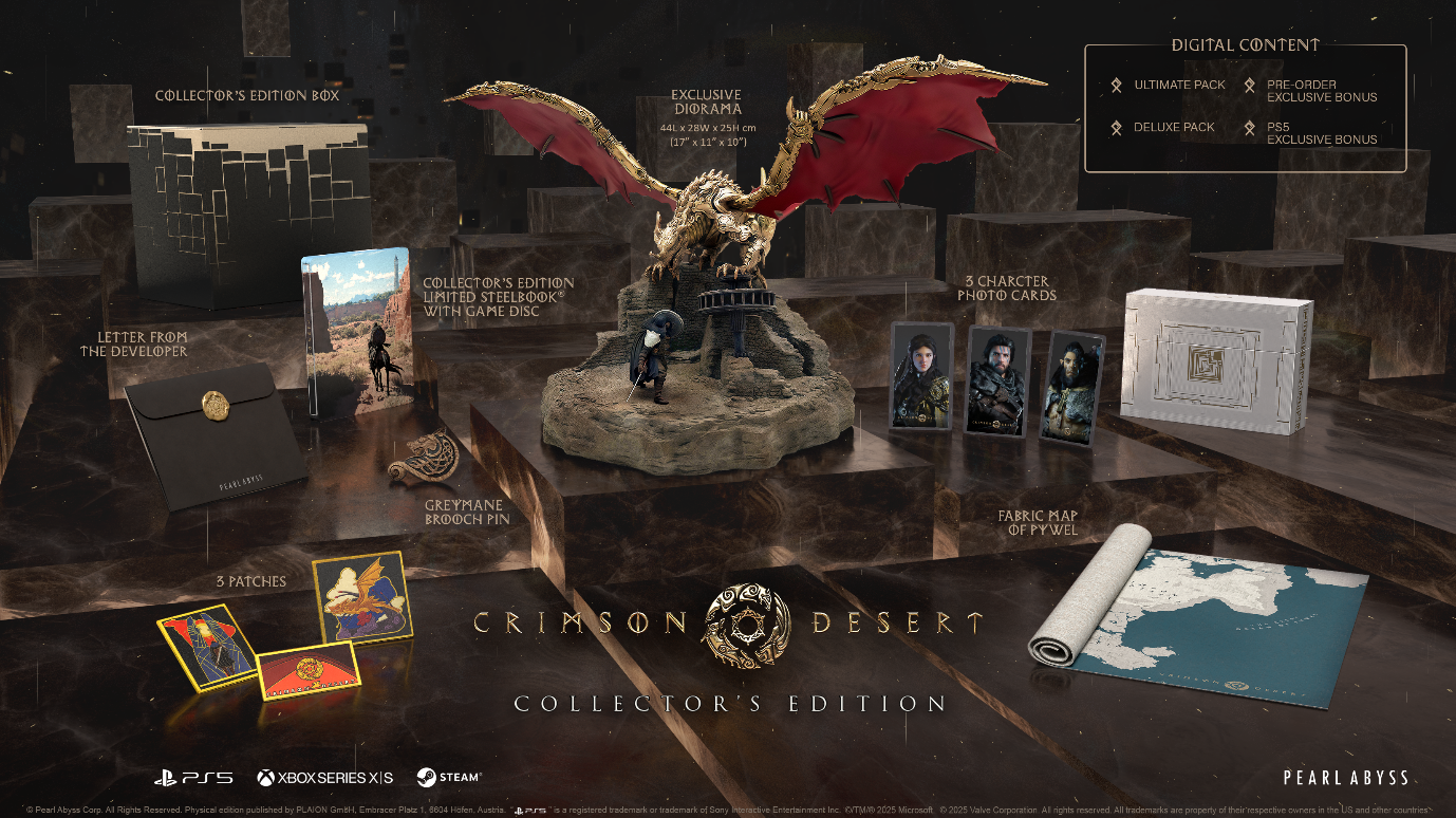 Crimson Desert sarร  disponibile nelle edizioni Collectorโ€™s, Deluxe e Day One, con contenuti esclusivi tra cui diorami da collezione, mappe in tessuto e bonus digitali. I preordini sono giร  aperti, con lo Scudo di Khaled come bonus speciale. Inoltre, chi sceglierร  la versione PlayStation 5 riceverร  in esclusiva il DLC “Set a piastre di Grotevant”.