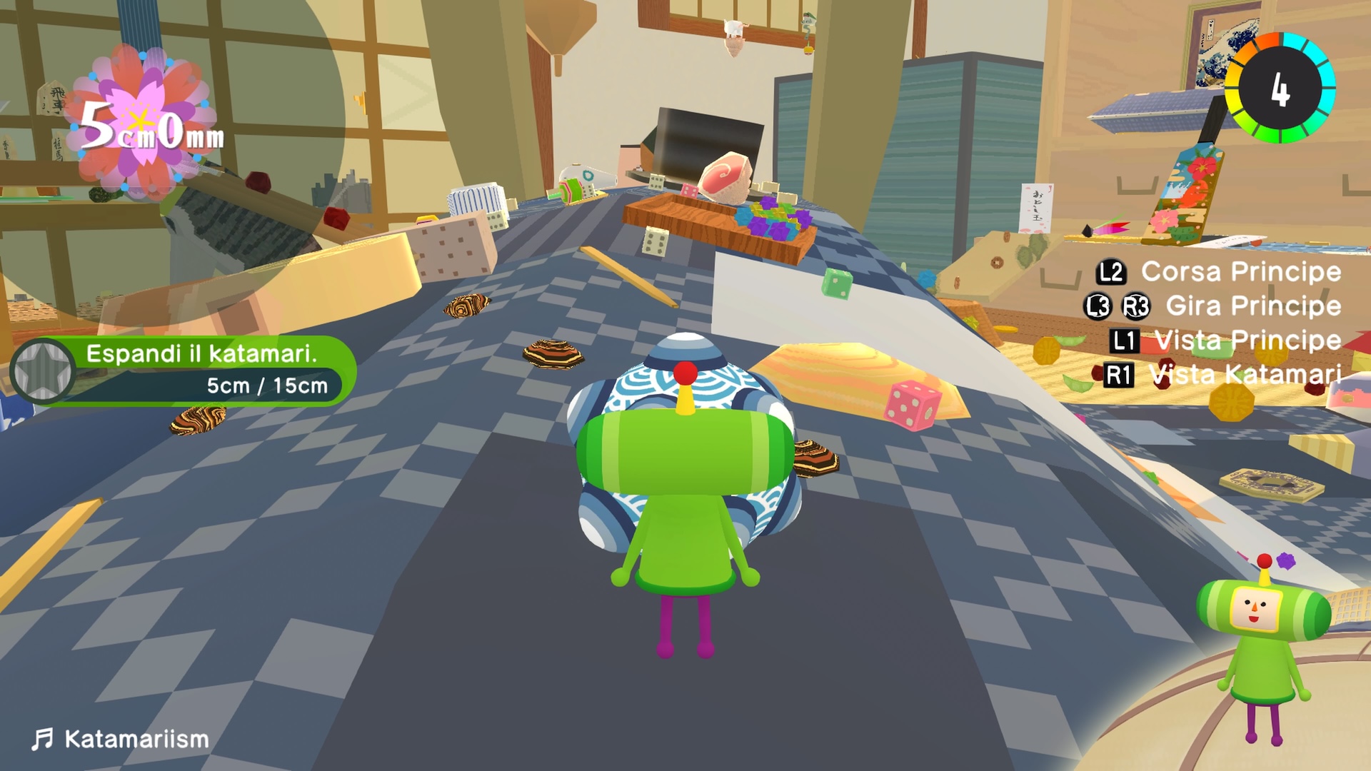 Sicuramente non è un gameplay che pretende realismo, ma riesce comunque a toccare delle corde semplici come il piacere puro del movimento e della crescita. Le missioni sono differenti, come raggiungere una specifica grandezza del Katamari nel tempo dato oppure raccogliere il numero o la tipologia di oggetti richiesti. Se all’inizio appaiono divertenti, alla lunga possono essere però ripetitive. In ogni caso, al completamento, il Re del Cosmo ci assegna un punteggio e la nostra sfera viene spedita nel cielo per diventare un pianeta o un satellite dal nome improbabile. Se invece falliamo, il nostro amato padre non manca di ricordarci che, se il gioco non piacerà ai fan, sarà solo colpa nostra. Lungo i vari livelli, inoltre, abbiamo la possibilità di raccogliere anche i nostri cugini, che per un motivo o per un altro si trovano in viaggio nel tempo anche loro. Una volta raccolti, all’interno della nostra navicella temporale, possiamo cambiare il Principe con loro e vivere l’avventura in panni differenti. Qui possiamo anche modificare il nostro stile o la musica di sottofondo. Una piccola aggiunta per dare un tocco di varietà e personalizzazione a tutta l’avventura, senza troppo successo. In ogni caso, Once Upon a Katamari è un gioco che diverte, rilassa e a tratti commuove per la sua ingenua poesia. Un’esperienza sensoriale, una metafora travestita da giocattolo che, nonostante il tempo trascorso dalla sua ultima comparsa, continua a brillare.