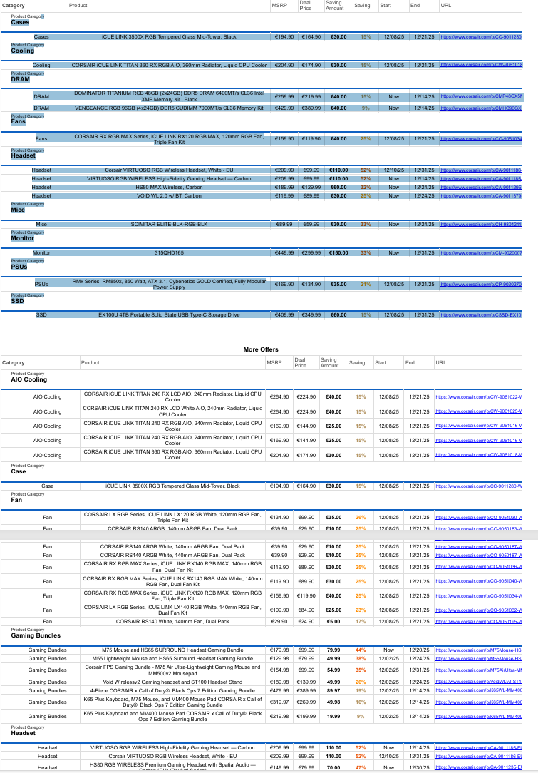 Secondo quanto annunciato recentemente, CORSAIR ha annunciato le offerte Holiday Special, in modo tale che i consumatori possano acquistare alcuni prodotti dell’azienda ad un prezzo scontato, valideย dallโ€™8 dicembre (alcuni prodotti possono avere date di inizio o fine diverse). Ecco le offerte in questione: