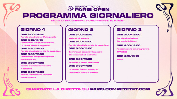Per seguire il TFT Open di quest’anno ci sarà qualche novità interessante. Il primo giorno il torneo principale sarà visibile esclusivamente tramite i co-streamer ufficiali, mentre la trasmissione principale proporrà partite di esibizione e pannelli con gli sviluppatori. Il secondo giorno i co-streamer continueranno a seguire il torneo fino all’avvio della trasmissione principale, che partirà dal Turno dei 64 e includerà ancora partite di esibizione e momenti con gli sviluppatori. Il terzo giorno si potrà guardare la finale sia tramite i co-streamer ufficiali sia sulla trasmissione principale, dove verrà incoronato il Campione del TFT Paris Open 2025.