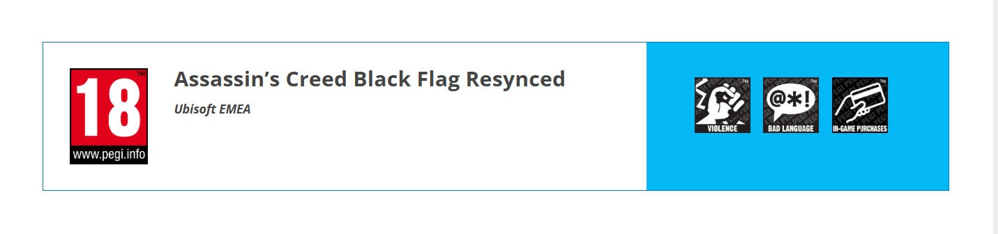 Come segnalato da Insider Gaming, riprendendo il post su X dell’utente Corkben, Assassin’s Creed Black Flag Resynced è stato valutato dal PEGI. Qui sotto l’immagine, dal sito proprio del PEGI.