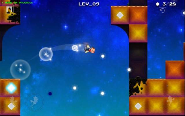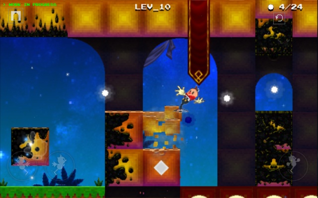Inizialmente i comandi sono, oltre le direzioni, il salto e il pugno. Al momento l’unica funzione dell’attacco รจ quella di colpire dei punchball per far fuoriuscire delle sfere. Il game designer ha perรฒ fatto sapere che questa versione รจ sostanzialmente “pacifica”, e che successivamente verranno inseriti anche dei nemici. Il punto di svolta, in termini di gameplay, arriva quando Boingkid apprende il super salto. All’interno dei livelli sono posizionati dei cubi con dei rombi lumiosi. Posizionando Boingkid sopra questi cubi, se si tiene premuto sopra il personaggio e lo si carica (modello Angry Birds per far capire al volo), il tenero giocattolino potrร  arrivare in posti altrimenti irragiungibili. E qui arrivano le prime difficoltร : cadute, massi che intralciano, salti troppo corti. Il tutto, ovviamente, per aumentare il livello di sfida. Io poi, per qualche strano motivo, attratto dalla luce, tendevo a spingere sopra i rombi invece che sopra al protagonista. In caso di morte, ahimรจ, si ricomincia il livello daccapo. Il game designer mi ha perรฒ detto che potrebbe mettere dei livelli piรน lunghi con dei checkpoint.