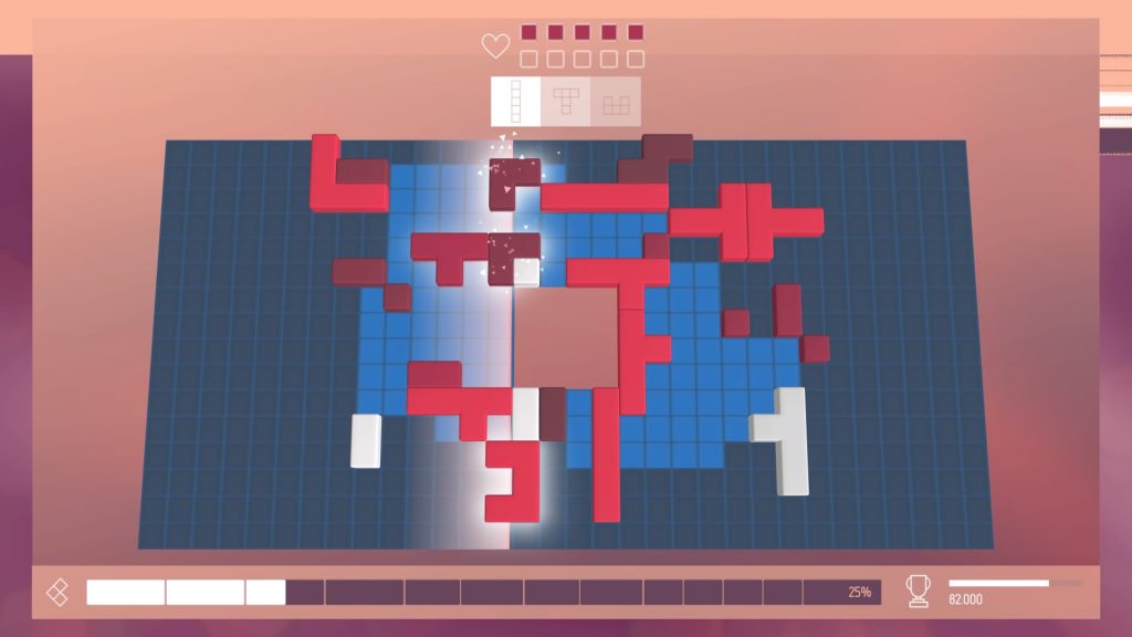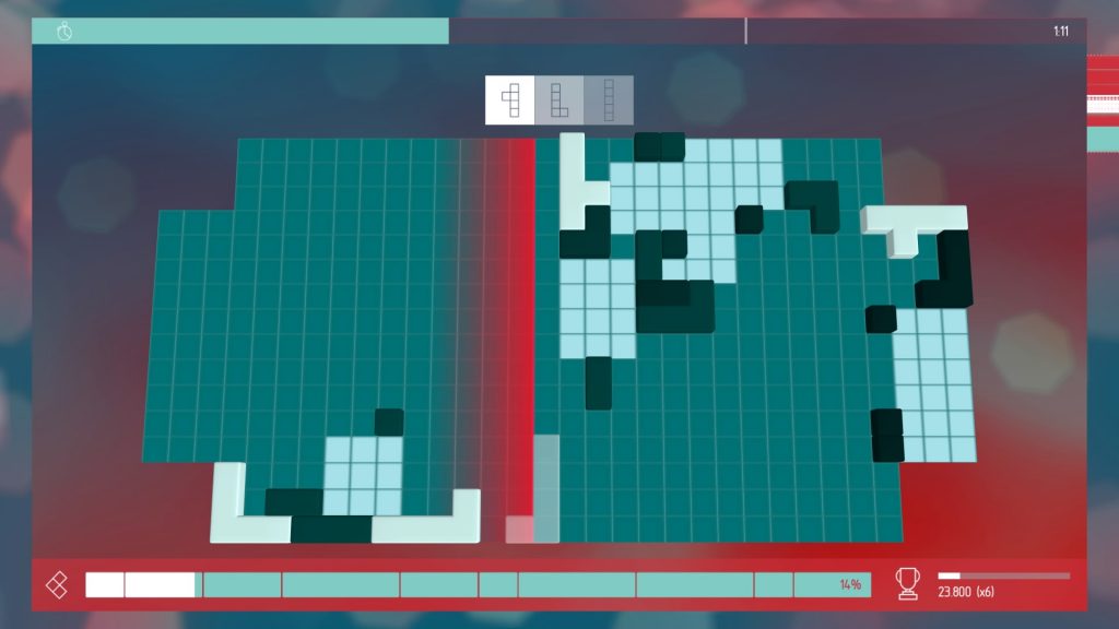 Il gioco ha quattro modalità diverse (5 con l’allenamento libero), distribuite equamente nei 16 livelli di gioco. Nella prima, quella standard, dovrete colorare lo stage il più possibile, dando però sempre un’occhio al tempo. I pochi minuti a disposizione saranno infatti il vostro primo vero nemico. Se sarete bravi e riuscirete comunque a coprire almeno il 60% del livello, sbloccherete la modalità Sharp. Qui non vi dovrete preoccupare di alcuna clessidra, ma dei “residui” dei pentamini che non sono riusciti a far parte di un quadrato/rettangolo. Dopo un tot di tempo, infatti, queste “scorie” verranno eliminate automaticamente dallo stage, facendovi perdere una vita. Dieci vite perse, game over. Se riuscirete (ve lo ridico di nuovo, proibitivo) a coprire il 60% di Sharp, sbloccherete la modalità Strike, dove le vostro capacita di pensiero verranno messe ad una prova ancora più ardua. Dovrete coprire la griglia in appena un minuto e mezzo. Infine, se riuscirete (se), a fare il 100% nella modalità standard, sbloccherete la modalità Challenge, dove avrete a disposizione un determinato tipo di figure da usare.