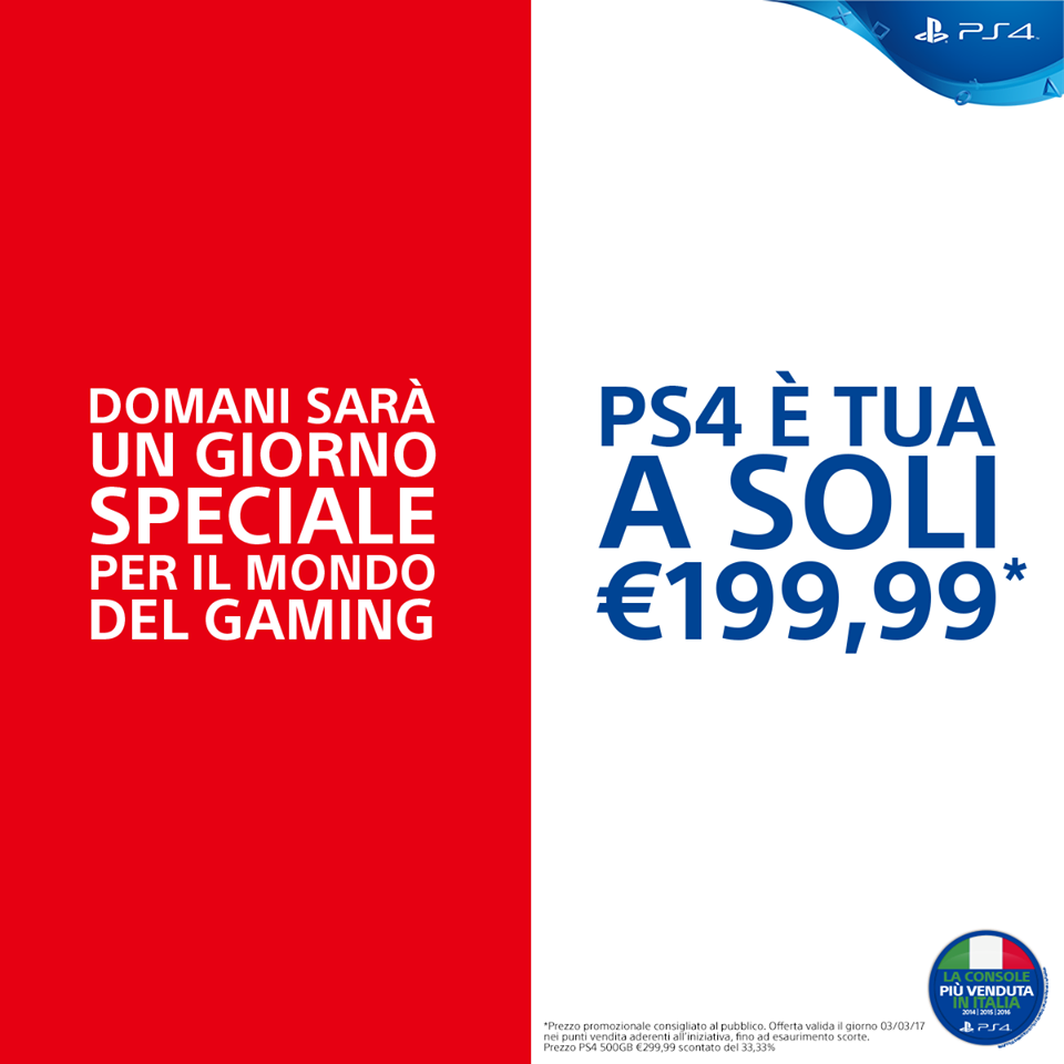 Che Sony in questa generazione sia l’azienda più prolifica dal punto di vista delle vendite è indubbio. Nonostante questo, il colosso giapponese ha tutta l’aria di voler continuare a spadroneggiare contro i competitor.  L’azienda ha escogitato un modo tutto suo per festeggiare l’arrivo della nuova console Nintendo: solo per domani, infatti, la Playstation 4 Slim da 500 Gb sarà disponibile al prezzo di €199.99. Mossa di marketing veramente degna di nota tra l’altro, considerando la recente uscita di Horizon: Zero Dawn. La frase con cui la compagnia sponsorizza l’iniziativa è quantomeno interessante, ma potete osservarla voi stessi all’interno dell’immagine che segue.