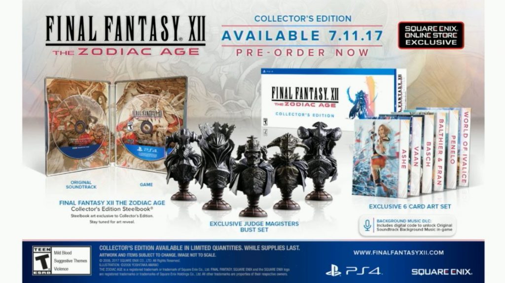 Sappiamo già che l’11 luglio arriverà in Europa Final Fantasy XII: The Zodiac Age, remastered dell’omonimo titolo uscito nel lontano 2006 su PlayStation 2, ma fino a poche ore fa il pubblico non era a conoscenza delle edizioni prenotabili, oltre ovviamente a quella base. In aiuto dei collezionisti è arrivata proprio Square Enix che, durante il PAX East 2017, ha annunciato due special edition: la Steelbook e la Collector’s. La prima contiene il gioco, un DLC con le musiche di sottofondo, la possibilità di scaricare la colonna sonora ufficiale e, come dice il nome dell’edizione, una custodia metallica con sopra un disegno di Akihiko Yoshida.