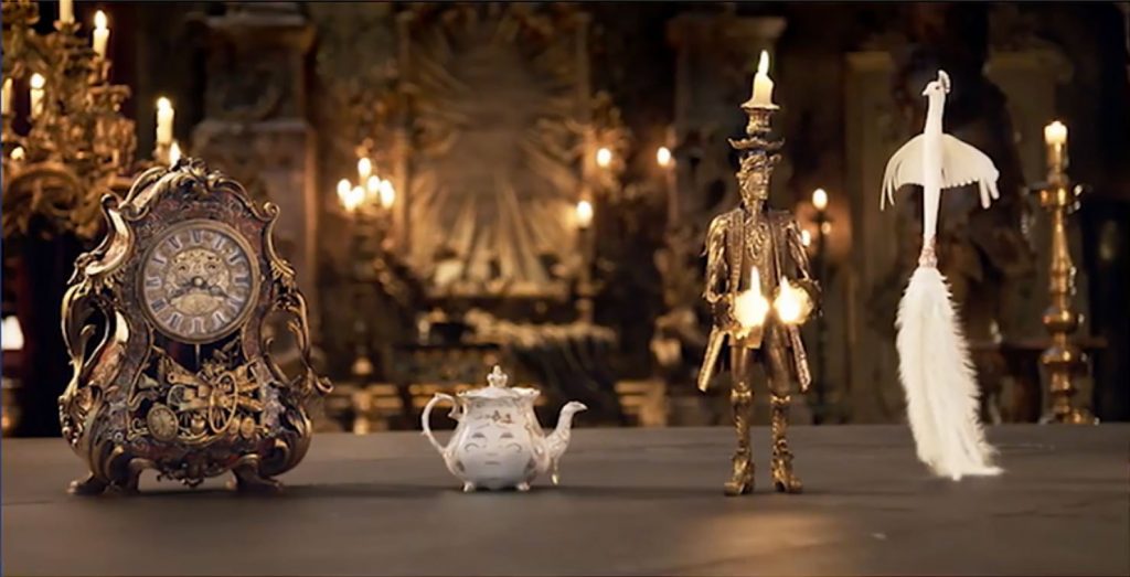 Passando invece al resto dei personaggi, nelle vesti di oggetti animati, il lavoro dietro di essi è a dir poco certosino per quanto riguarda in special modo Lumière e Tockins, i cui dettagli possono essere osservati in ogni angolo degli elementi a cui appartengono: un candelabro e un orologio a pendolo. Esaminando gli altri, probabilmente si sarebbe potuto fare qualcosa di più per Madame Guardaroba e Mrs. Bric, le cui personalità di certo non sono state perfettamente trasposte sugli oggetti che rappresentano; una particolare attenzione va posta invece a Spolverina, che, seppur di minor importanza, è stata sviluppata in un modo davvero soddisfacente.