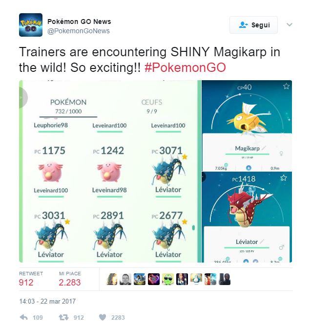 Un tweet contenente le immagini di Magikarp e Gyarados Shiny.
