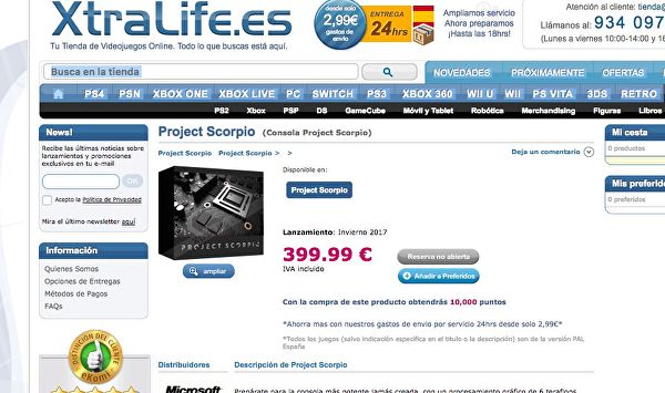 Microsoft ha da poco rivelato al mondo le specifiche tecniche di Xbox Scorpio, senza però fare nessun accenno al possibile prezzo della console. Il rivenditore spagnolo XtraLife potrebbe aver svelato il prezzo della nuova piattaforma, aggiungendola al proprio listino col prezzo di 399.99€. Se fosse vero la nuova console ammiraglia di casa Redmond potrebbe competere benissimo con Playstation 4 Pro. C’è comunque da tenere in considerazione il fatto che potrebbe trattarsi di un semplice errore, teniamo quindi a consigliarvi di prendere con le pinze la notizia. Sicuramente avremo informazioni più concrete durante l’E3 di giugno, vi invitiamo perciò a rimanere con noi per essere aggiornati sulla questione.