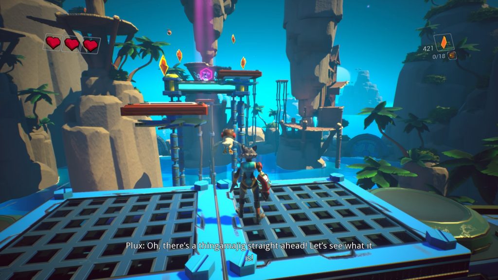Una volta avviato il titolo vi ritroverete nelle vesti della gatta Skylar. Quest’ultima sarà inizialmente imprigionata dalla malvagia intelligenza artificiale CRT su di una nave spaziale. Grazie all’ausilio del suo braccio robotico parlante, e dopo una prima sezione di tutorial, la protagonista riuscirà a scappare dalle grinfie del perfido computer ed atterrerà su quella che è l’ambientazione principale del gioco, Clover Island. Arrivati a questo punto incontrerete Plux, simpatico pennuto che si unirà a voi nel tentativo di sventare i piani di conquista mondiale di CRT.