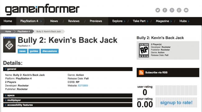 Potreste aver letto segnalazioni secondo le quali abbiamo annunciato l’esistenza di Bully 2. Ma si tratta di un errore. Non abbiamo alcuna informazione sul possibile sequel di Bully.