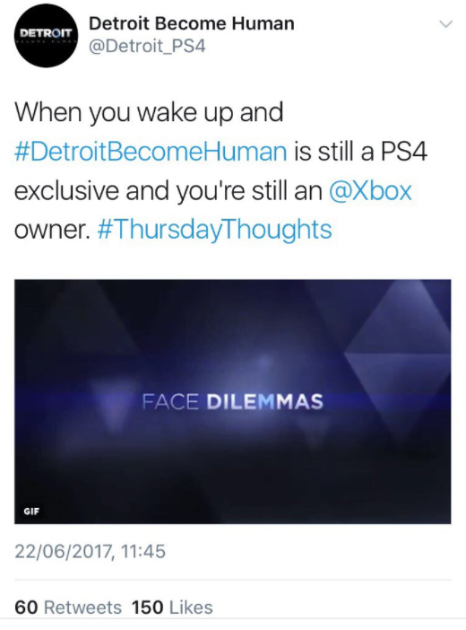 Quando ti svegli e #DetroitBecomeHuman è ancora un’esclusiva PS4 e tu sei ancora un possessore di Xbox. #ThursdayThoughts