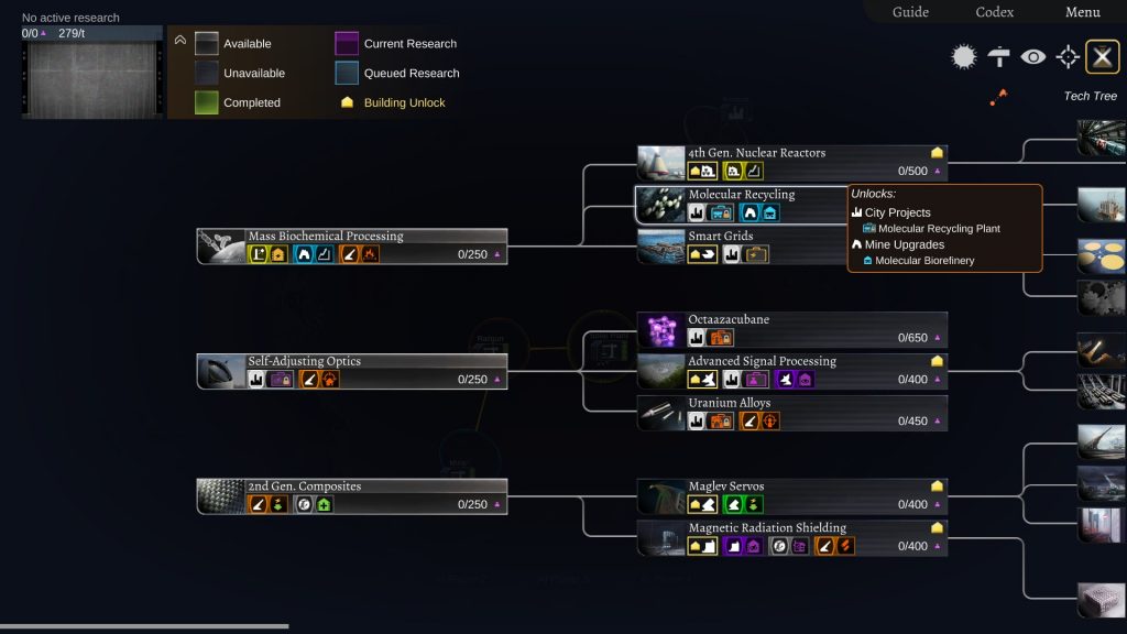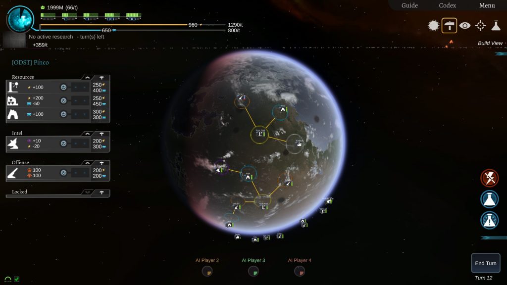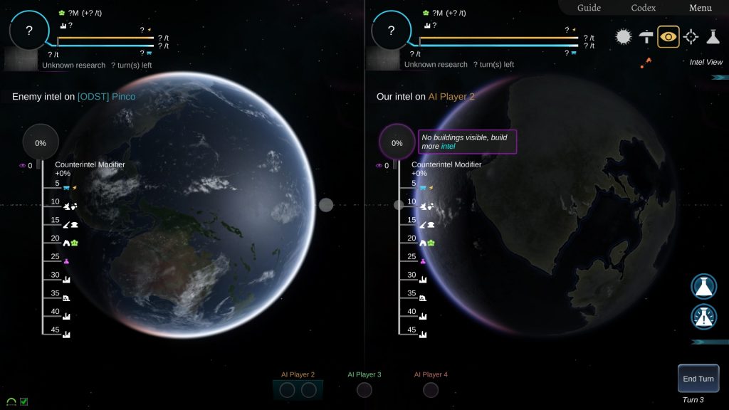 È presente uno skill tree che vi permetterà di sbloccare nuove costruzioni ed upgrade durante il corso della partita. Ogni abilità va sbloccata raggiungendo il quantitativo di intelligenza necessario. Quest’ultima viene prodotta ad ogni turno in quantità direttamente proporzionali al numero di abitanti presenti sul vostro pianeta ed è utilizzata anche come risorsa per la costruzione dei sistemi riguardanti lo spionaggio.