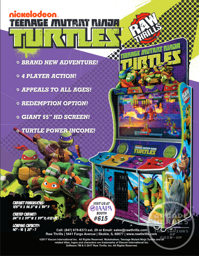 Stando a quanto riporta il sito Arcade Heroes, è in arrivo un nuovo cabinato delle Tartarughe Ninja. Raw Thrills, lo sviluppatore di arcade dietro a giochi come Batman: The Arcade Game, H2Overdrive e il più recente Injustice Arcade è infatti al lavoro per un nuovo titolo da sala giochi con protagonisti Leonardo, Michelangelo, Donatello e Raffaello. Il titolo sarà presentato allo IAAPA 2017, expo che si terrà dal 13 al 17 novembre a Orlando. Tutti gli asset di gioco sono presi dalla più recente serie televisiva delle tartarughe trasmessa da Nickelodeon, e proverà a rivoluzionare il concetto di Beat’em up per quattro giocatori. Qui sotto la locandina.